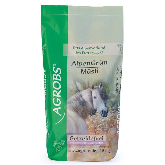 OBS: AGROBS ALPENGRÜN Müsli er ikke tilsat vitaminer og mineraler. Hesten skal derfor dækkes ind hermed, via øvrigt foder, eller ren vitamin/mineral blanding.