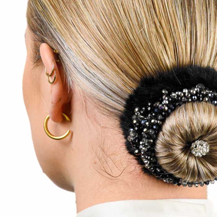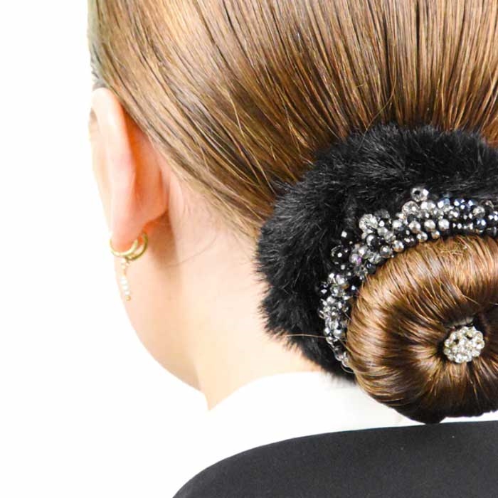Nightshade Reflection består af 3 elastikker - sort faux fur, elastik med store sort/sølv/klare rhinsten, elastik med små sølv/sorte rhinsten, samt en glitrende hårnål.