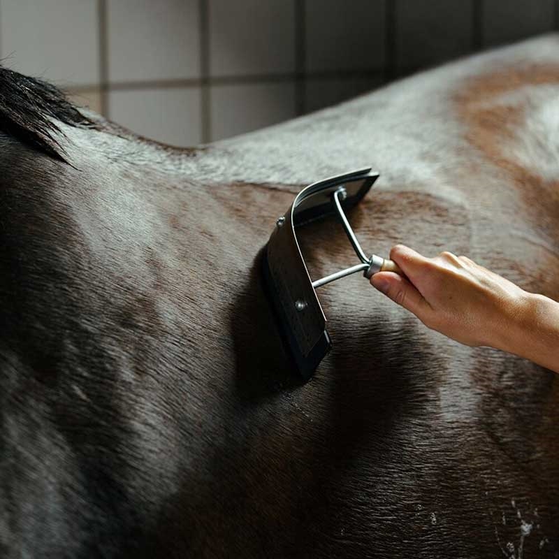 Klassisk svedskraber med ergonomisk formet træhåndtag. Med blød gummiliste der skånsomt skraber sved/vand af hesten.