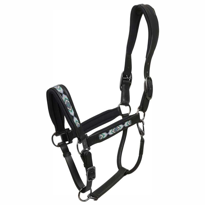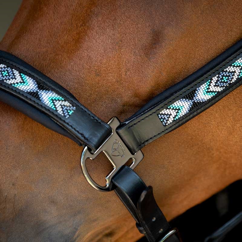 Catago lædergrime Anamo i sort er en elegant og komfortabel grime i blødt læder med eksklusive detaljer. Grimen er smukt dekoreret med perler i hvid, sort, blå og turkis på næserem og kindstykker, som tilsammen skaber et stilfuldt mønster. Nakkestykket er anatomisk formet og kan justeres i begge sider for optimal pasform og for at modvirke gnavesår.