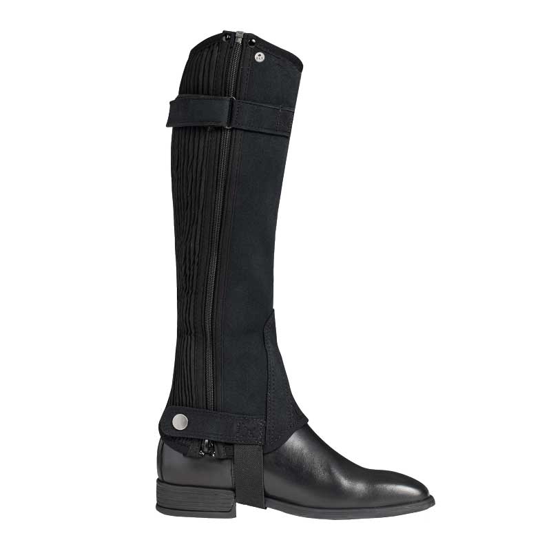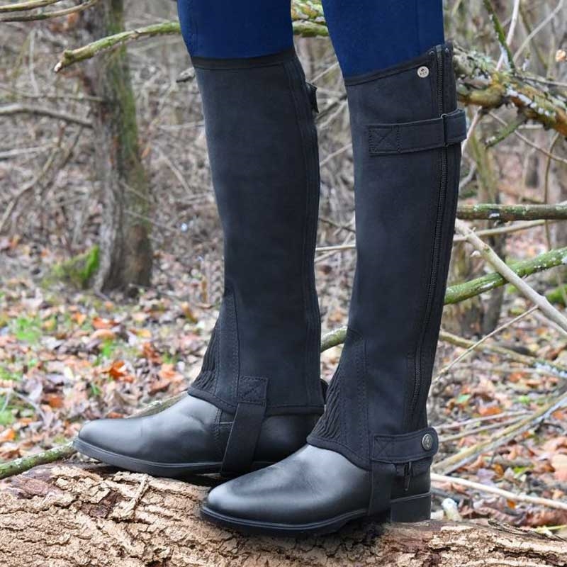 Den fleksible konstruktion følger barnets bevægelser i sadlen, mens lynlåsen bagpå gør dem nemme at tage af og på. Forstærkningen på indersiden af læggen giver ekstra beskyttelse mod slid fra stigbøjleremmen, og den klassiske sorte farve passer perfekt til enhver ridestil.