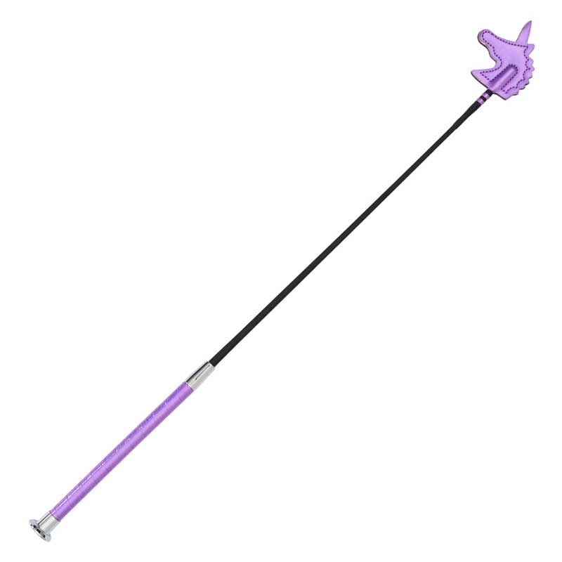 Flot pisk til børn i metallic lilla farve med svirp formet som hestehoved. Måler 65 cm.