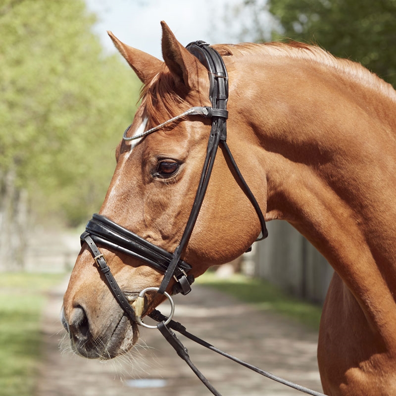 Denne model er fremstillet i rundsyet læder af høj kvalitet. Næsebåndet er med ekstremt blød foring af fåreskind der former sig efter hesten, det er 5 cm. bredt på midten, og bliver smallere i siden så der er bedre plads til biddet. Næsebåndet er med tilbagetræk, ligeledes med ekstra blød foring.