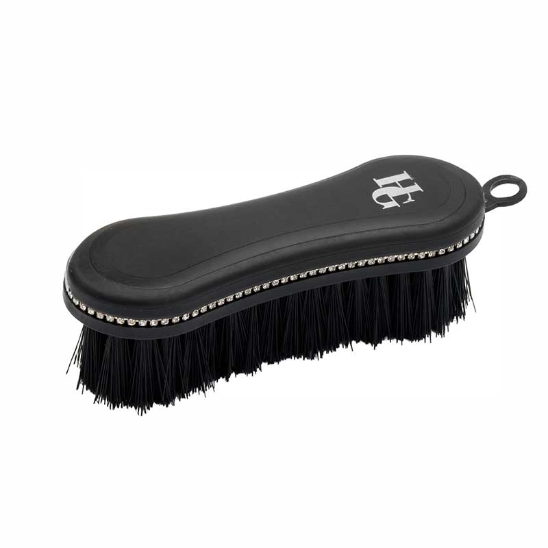 Klassisk hovedbørste med plast ryg og bløde nylonbørster, perfekt at bruge til hestens ansigt. I sort plast med en stribe glitrende krystaller langs kanten.