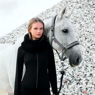 Grimen er lavet i slidstærkt nylon med bløde foringer, der sikrer høj komfort mod hestens hud. De børstede metalspænder giver et eksklusivt finish, mens de justerbare remme ved nakke og kæbe sikrer en perfekt pasform. Den praktiske karabinhage ved ganachen gør det nemt at tage grimen af og på – ideelt til daglig brug.
