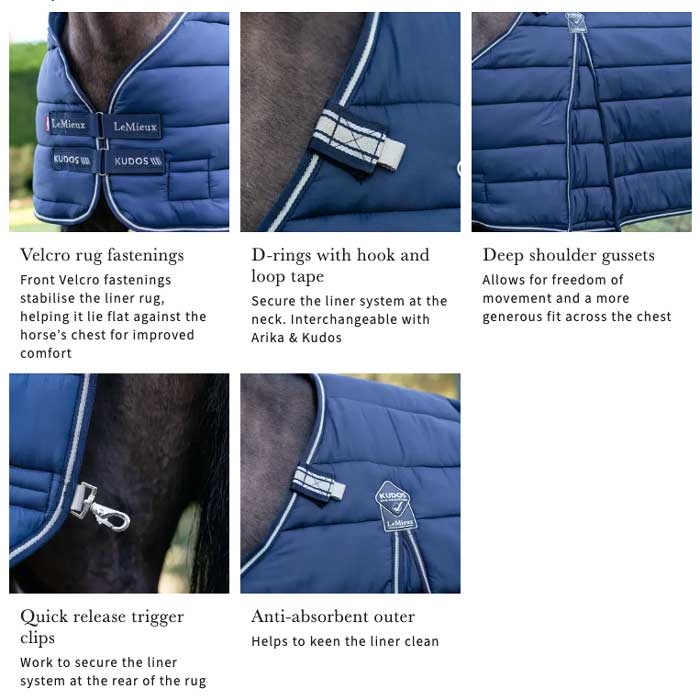 LeMieux "Kudos" liner 100g er en fantastisk smart løsning, der giver ekstra varme og komfort til din hest. Lineren er udviklet til at passe perfekt i LeMieux Featherweight, Arika og Kudos-dækkener og fastgøres nemt med velcro ved halsen og hurtigclips bagtil. Det gør det enkelt at tilpasse dækkenets isolering efter vejr og temperatur – uden at gå på kompromis med komfort eller bevægelsesfrihed.