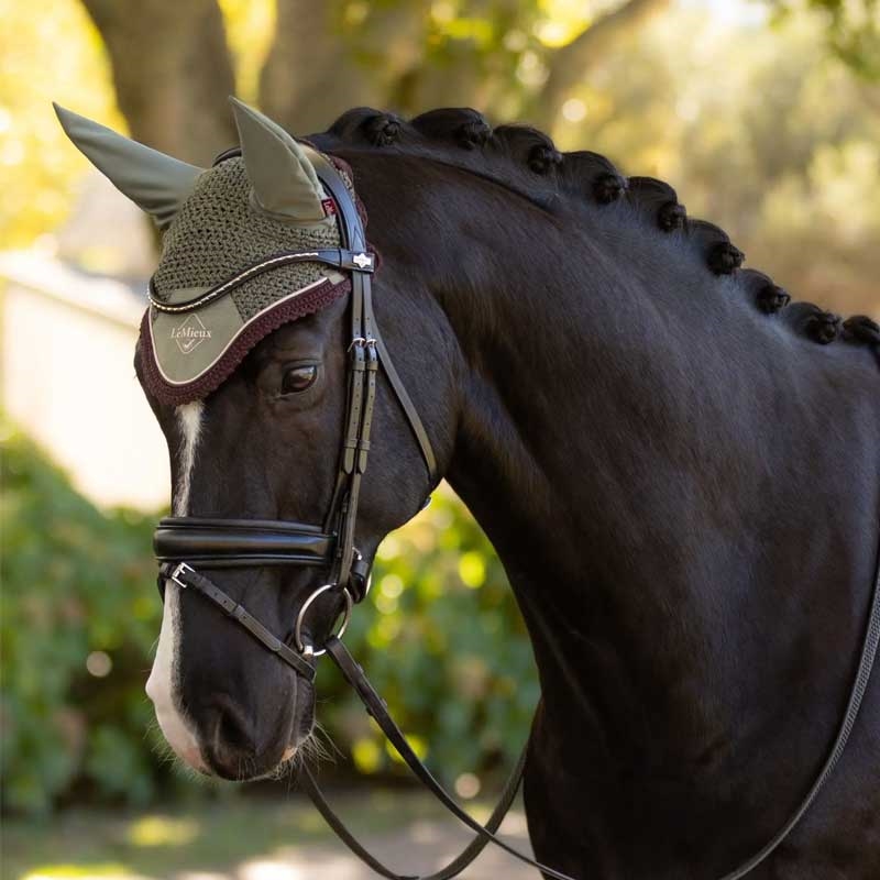 Hutten er håndlavet i smukt hæklet mønster og udstyret med bløde elastiske ørepartier, der giver din hest ro og komfort under ridning. De elastiske ører hjælper med at dæmpe distraherende lyde og beskytte mod insekter, så både træning og konkurrence kan gennemføres uden forstyrrelser.