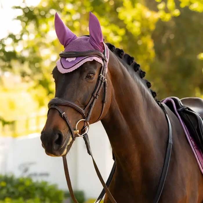 LeMieux Loire hut er en eksklusiv hut/fluehætte, der kombinerer elegant finish med praktisk beskyttelse mod fluer, støv og små forstyrrelser. Den håndhæklede front i 100% bomuld giver et klassisk look, mens 4-vejs stretch sikrer en tæt pasform under trensen. Hutten er afsluttet med flot kantbånd/piping, og frontstykket i satin fuldender Loire-udtrykket med et stilrent logo-badge. Ørerne er lavet i blød elastan, som sidder behageligt og følger ørernes form, så hesten kan arbejde uforstyrret.