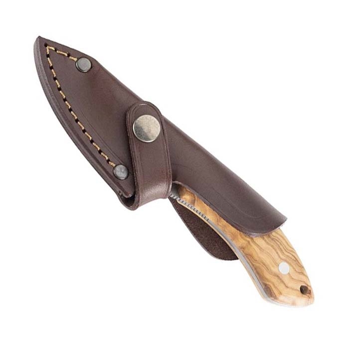 Det flotte skaft i oliventræ giver kniven et varmt og klassisk look, mens den kompakte størrelse gør den oplagt til jægeren, der ønsker en mindre fast kniv med god kontrol og en praktisk skede. Et godt valg til jagt, outdoor og generelle opgaver i naturen.