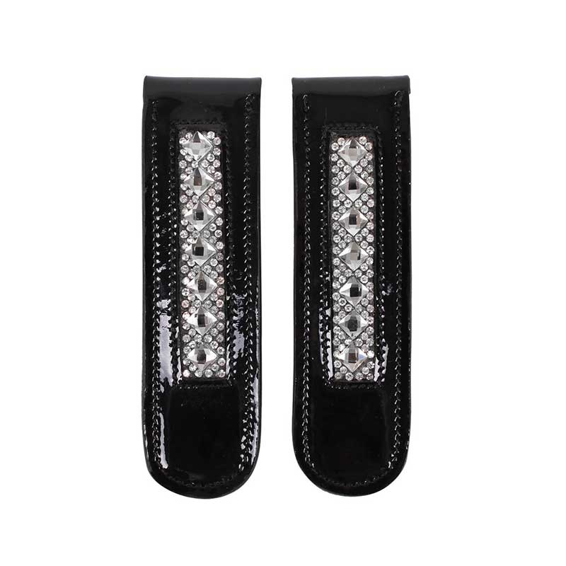 QHP støvleklips Sharina i sort lak med sølvdetaljer er den nemme måde at give dine ridestøvler et elegant løft. Støvleklipsene monteres hurtigt med en diskret metalklips og kan bruges på både ridestøvler og half chaps. Det blanke laklæder kombineret med diamantformede og runde rhinsten skaber et eksklusivt udtryk, der giver et mere personligt look – helt uden at gå på kompromis med komforten. Klipsene er lette, sidder stabilt og mærkes ikke under brug, hvilket gør dem ideelle til både hverdag og stævne.
