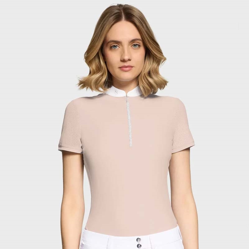 Samshield stævnebluse "Aloise" - Powder Pink er en stævneskjorte med underspillet elegance og teknisk komfort, skabt til konkurrencedage. Den slim fit pasform giver et flot, figursyet look, mens den opdaterede klassiske krave skaber en ren og moderne silhuet. Blusen er syet i åndbart, elastisk italiensk materiale, som føles let og behageligt, så fokus kan blive på ridtet. Perforerede zoner på nedre ryg og ærmer giver målrettet ventilation, når intensiteten stiger. Den fine teardrop-udskæring ved kraven med Swarovski blazon og den usynlige half-zip med Crystal Fabric fuldender det feminine udtryk.