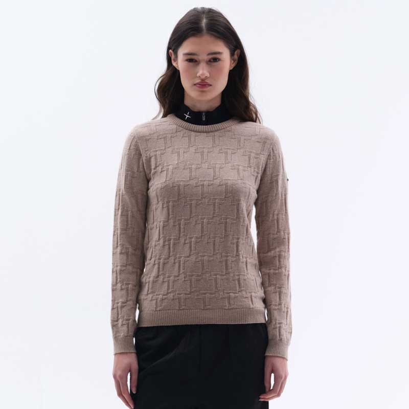 Trolle Projects sweater "Faded T Wool Cashmere" er en crew neck strik med et eksklusivt miks af ultrafin merinould og cashmere, der giver en behagelig varme, god åndbarhed og en let, blød fornemmelse. Strikken har regular fit og et rent, moderne udtryk med et diskret jacquardmønster, hvor T-logoet fremstår i en afdæmpet “faded” version. Ribkanter ved hals, ærmer og bund giver en pæn finish, og en logo rubber patch på overærmet fuldender looket. Produceret i Europa og velegnet til både stald, hverdag og rejsedage.